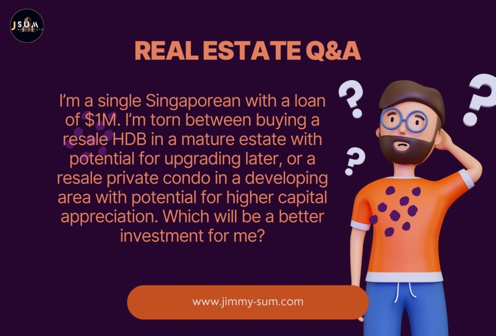 Qn 1: I'm a single local Singaporean with a loan of $1M. I'm torn between buying a resale HDB flat in a mature estate with potential for upgrading later, or a resale private condo in a developing area with potential for higher capital appreciation. Which will be a better investment for me? Hi there, Thank you for writing in via Whatsapp and allowing me to shed some insights into your dilemma that you...