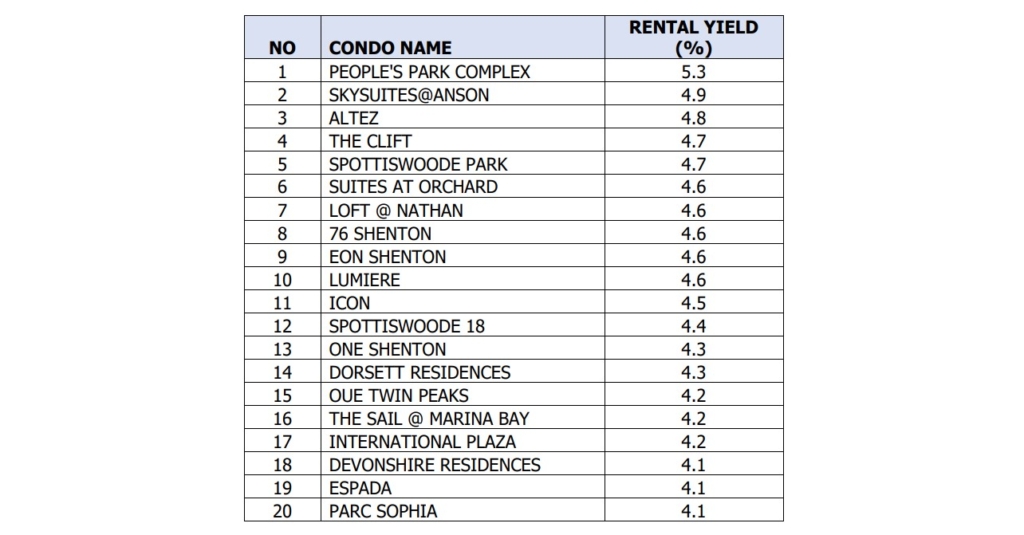 Below is the list of Top 20 High Rental Yield Condo in CCR