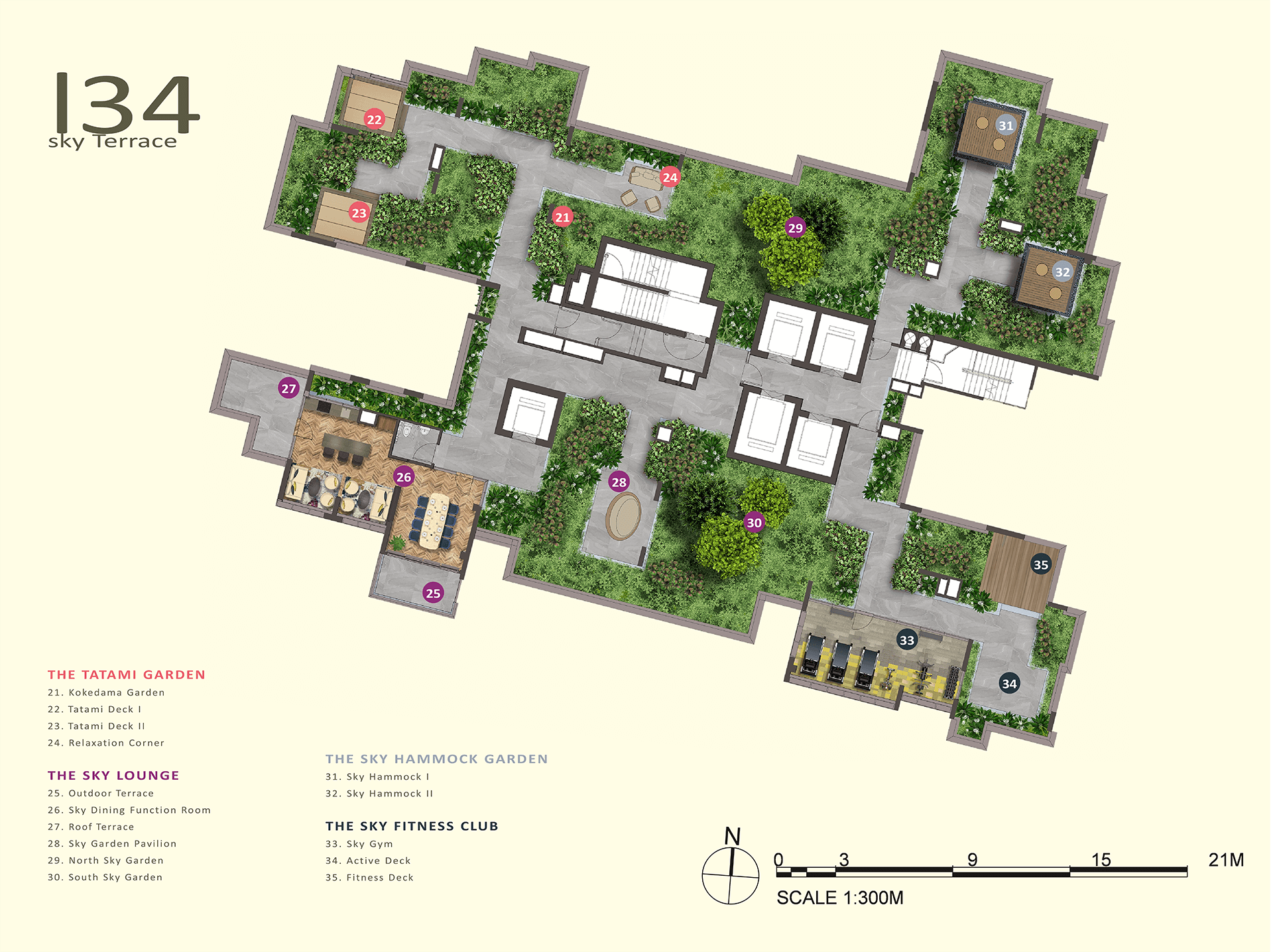- Kokedama Garden and Tatami Decks provide tranquil spaces.