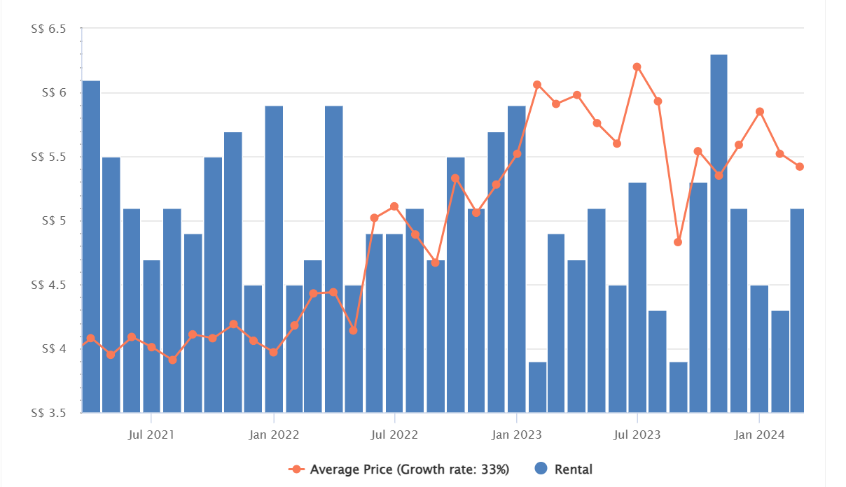 The graph below shows the rental trend for Ascentia Sky located in District 3. You can see that there has been a steep increase in 2022 and slowly tapers off in early 2023.